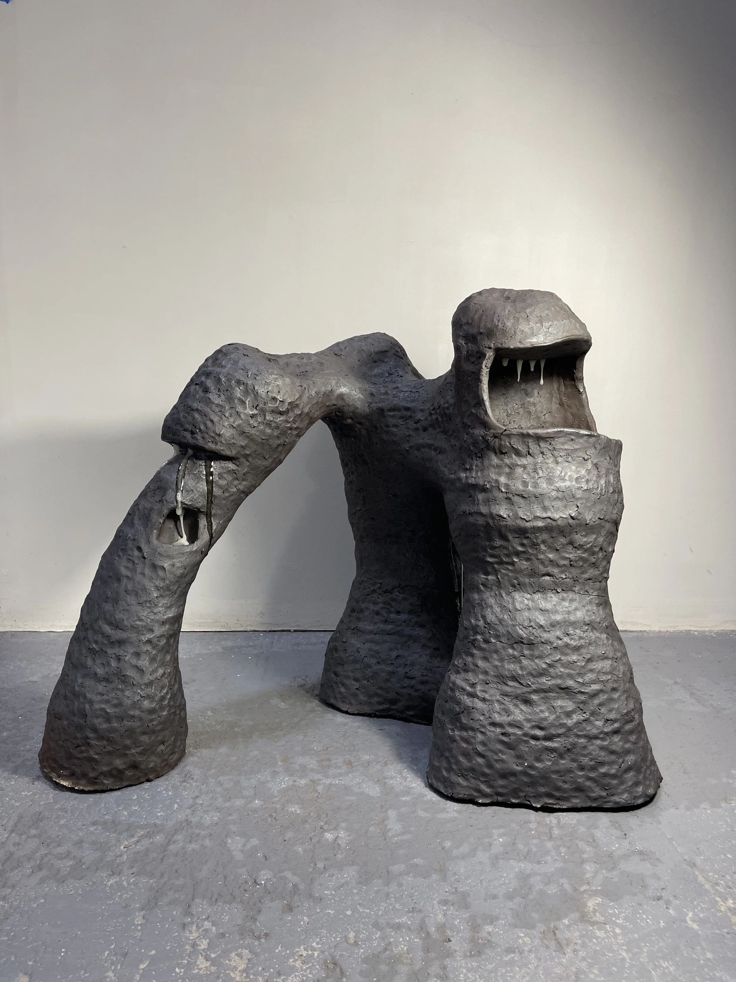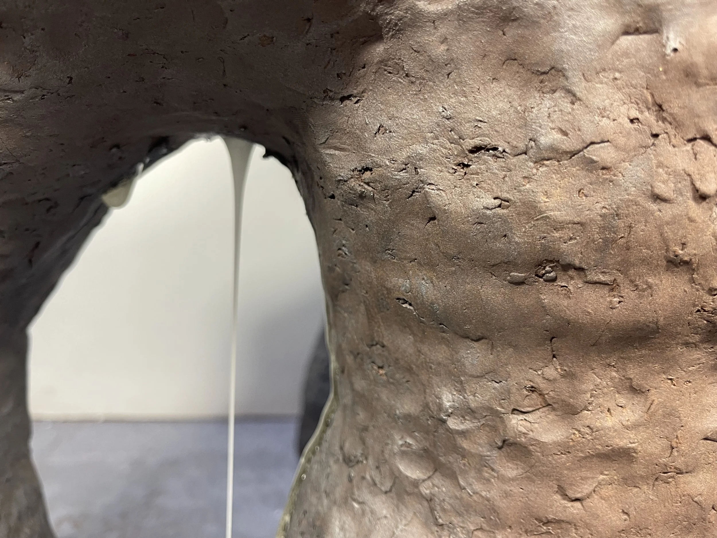Earthly Dues is a large ceramic form that honors the weight of existence. Built with a clay body and glaze developed from scratch, the piece echoes eroded landforms, burial mounds, or ancient creatures caught mid-transformation. It leans, arches, weeps. The scale insists on presence, yet its posture suggests surrender. The work is about what the earth takes back, what it gives, and the slow transactions between body and land.