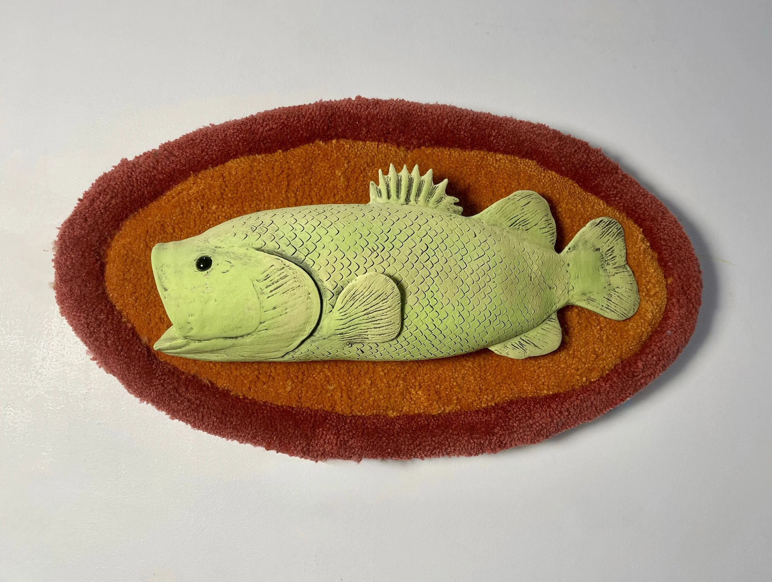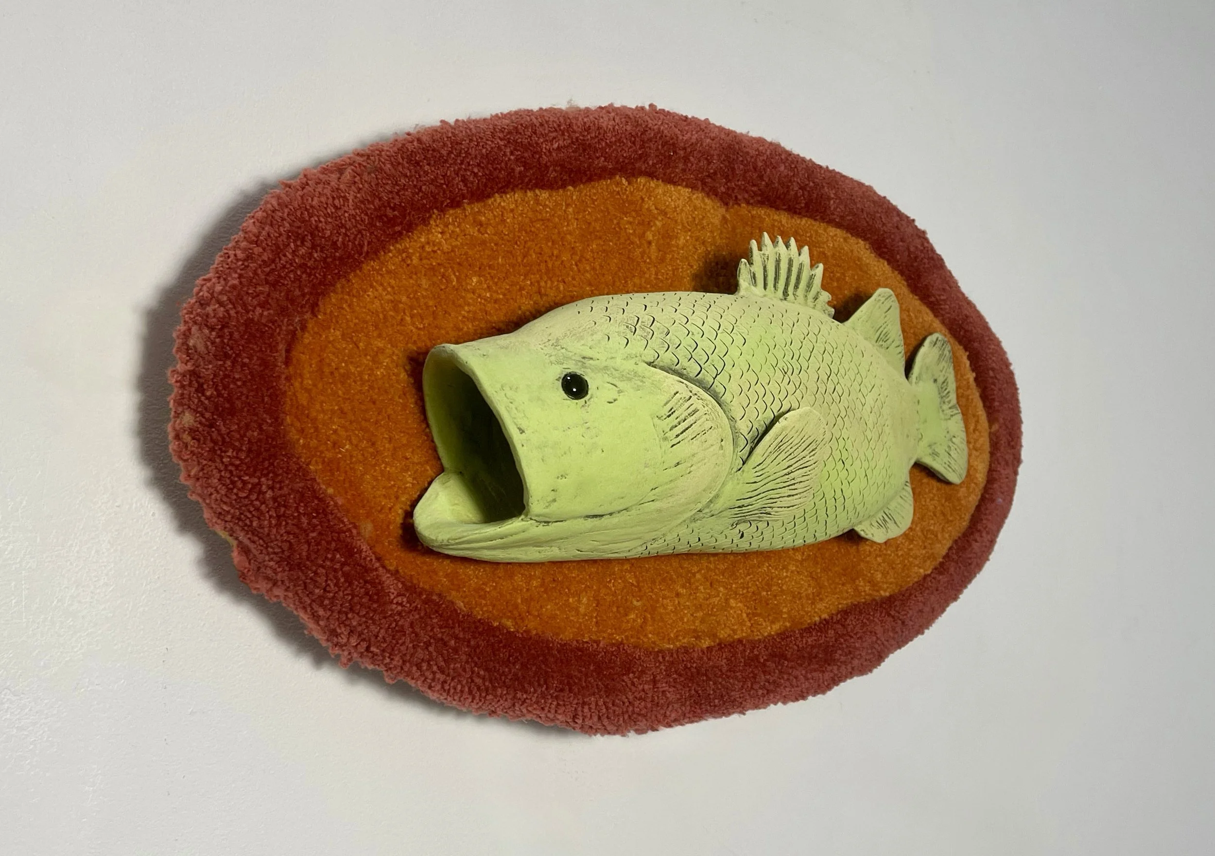 In The Holler reflects on the way we display and define the natural world. A ceramic bass, glazed in radioactive green, is mounted on an orange tufted plaque - recalling traditional taxidermy, but softened and reimagined. The unnatural colors and plush surface shift the piece away from realism, holding it somewhere in between an artifact and an offering. Like its companion, the two headed pike, this piece sits quietly between reverence and discomfort. Together they ask what we choose to preserve, and what those choices say about the way we live alongside the more-than-human world.