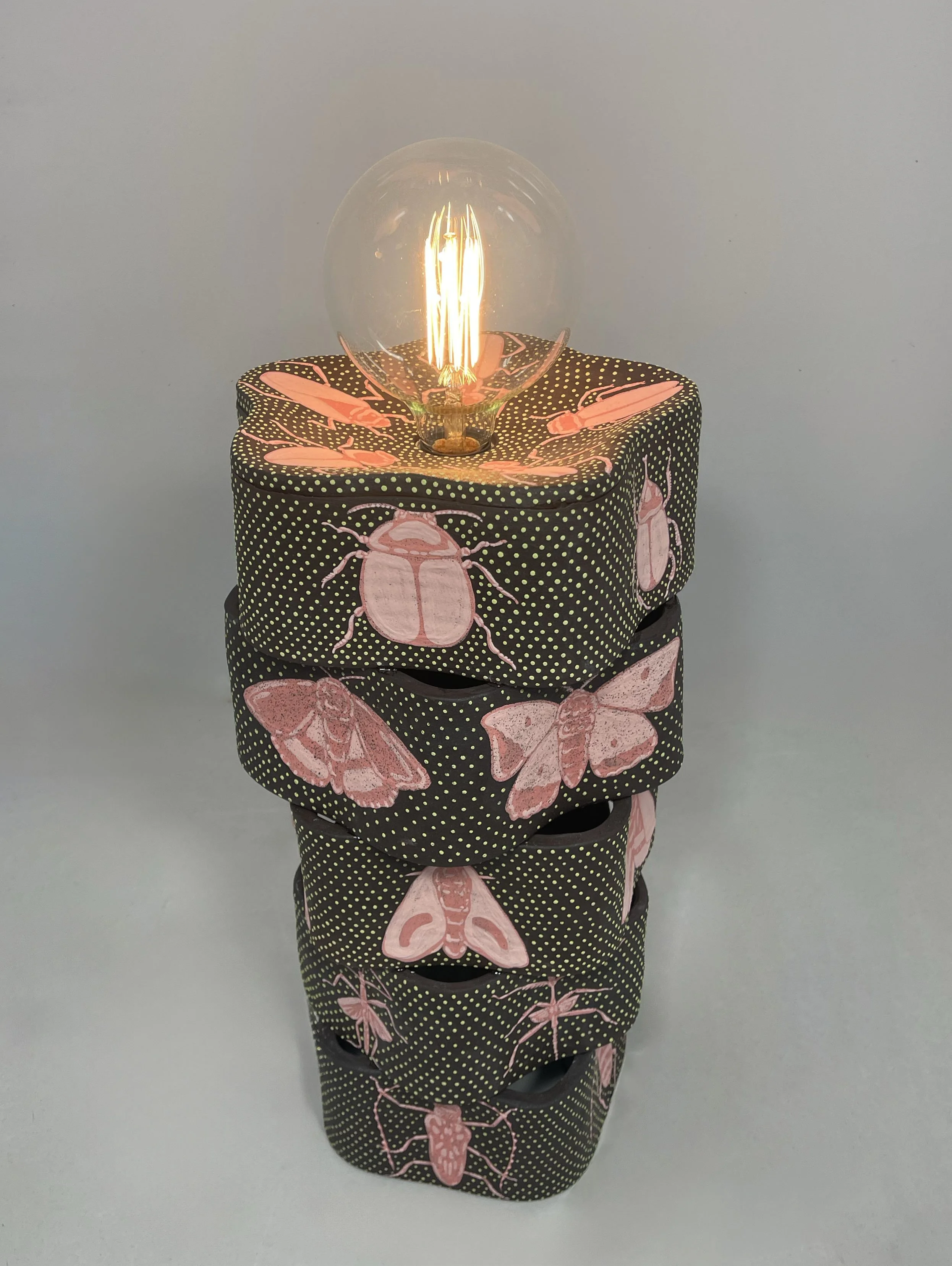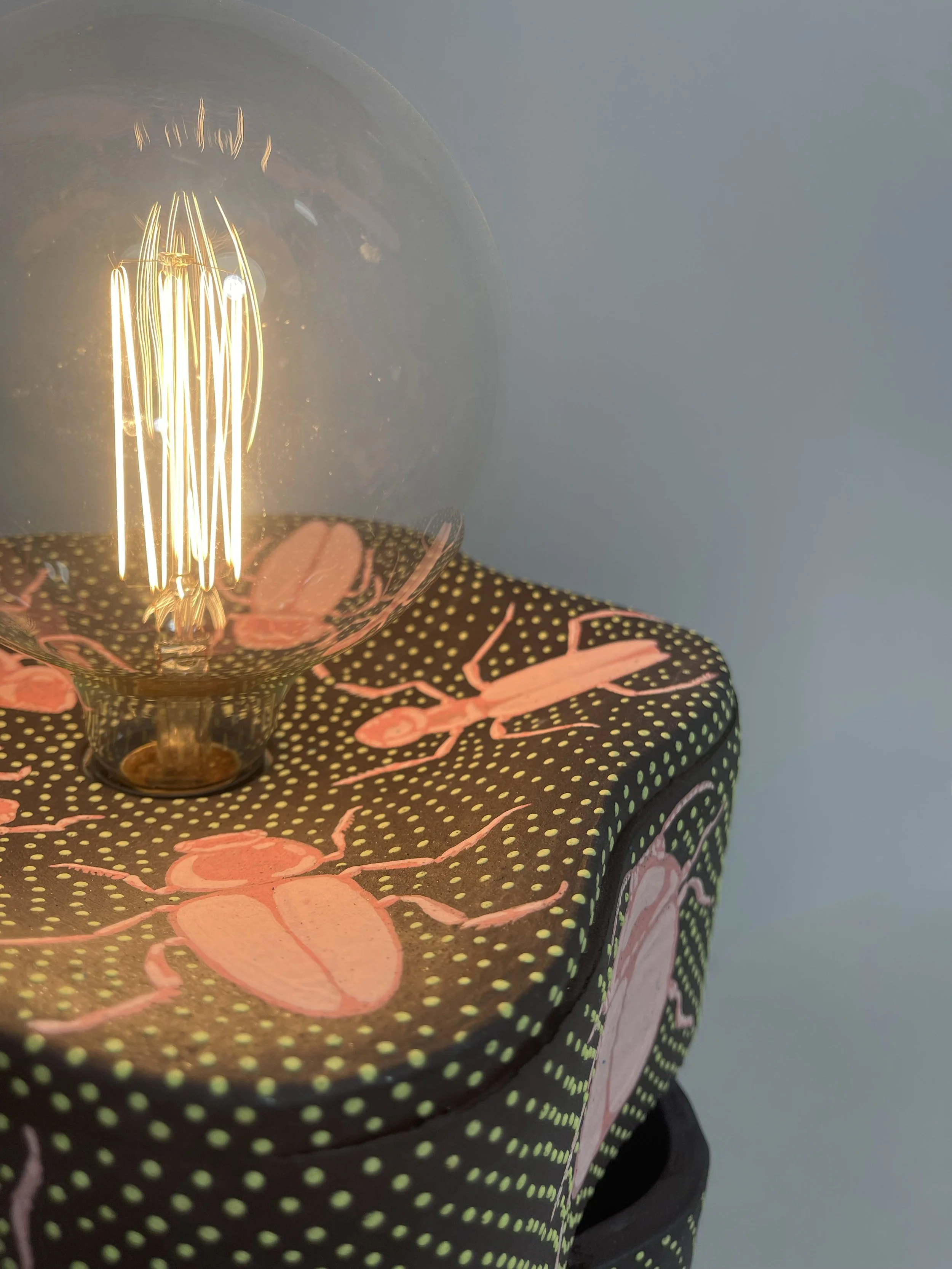 Into the Glow explores the quiet instinct that draws living things toward light. The sculptural lamp is surrounded by underglazed insects, captured in a moment of motion and magnetism. Their pull toward the light is both simple and ancient - part longing, part survival. The piece reflects on the beauty of that pull - how even the smallest creatures move toward brightness without question. It is about attraction without understanding, and the soft, wordless intelligence of the natural world.