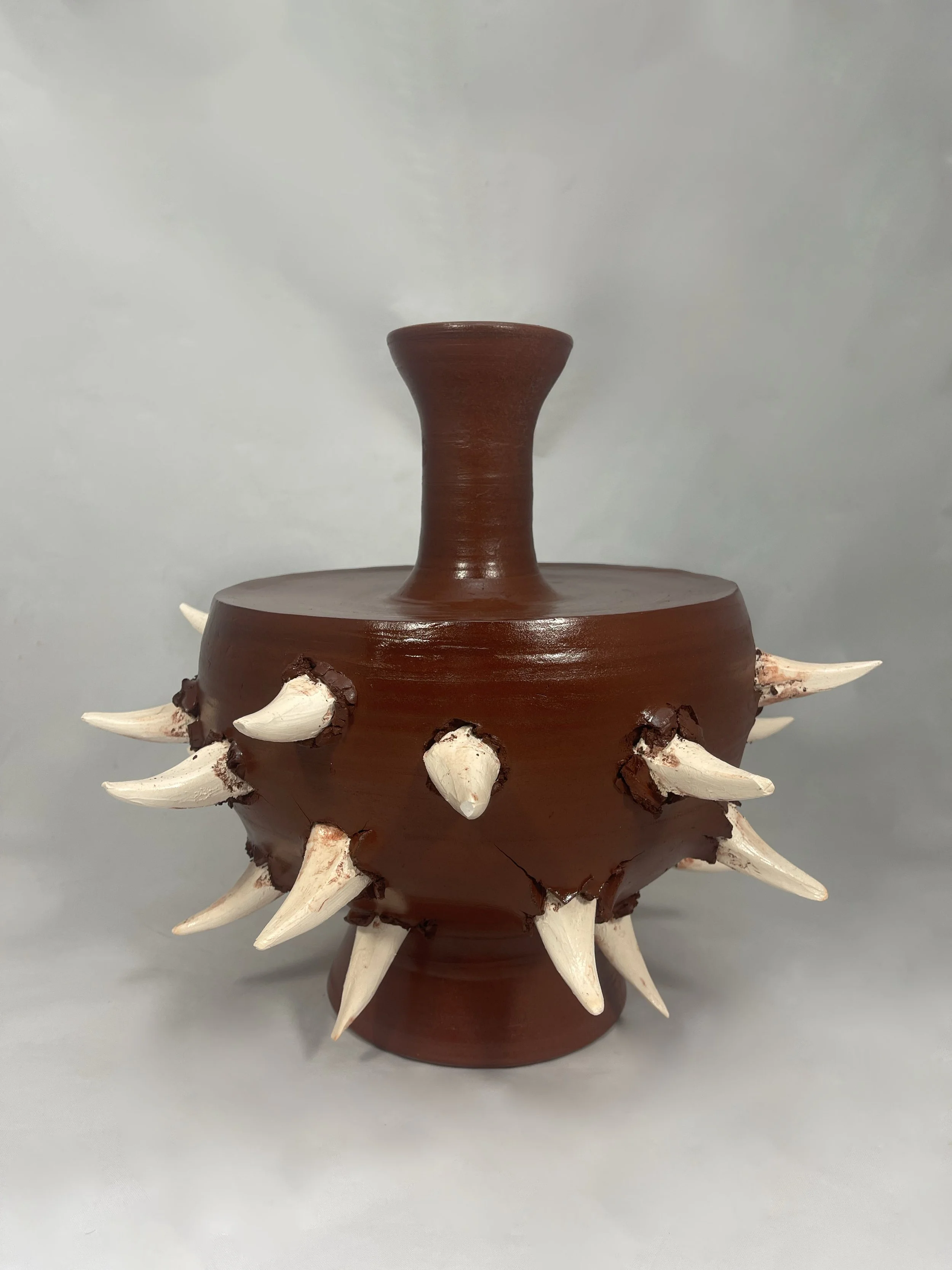 What We Try To Contain is a vessel that explores the illusion of control over the natural world. Its deep red clay body appears smooth and composed, but porcelain spikes rupture the surface. This project speaks to the futility of human efforts to restrain nature’s force. No matter how refined or regulated our structures become, the earth finds its way through. The piece evokes both violence and resilience, a reminder that Mother Nature does not ask for permission - she endures, resists, and reclaims.